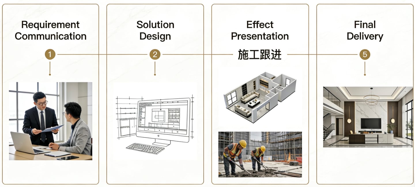◦ Clarify space type (villa/hotel/commercial), style preference (modern/luxury/classic), and core functional areas (feature wall/flooring/countertop).